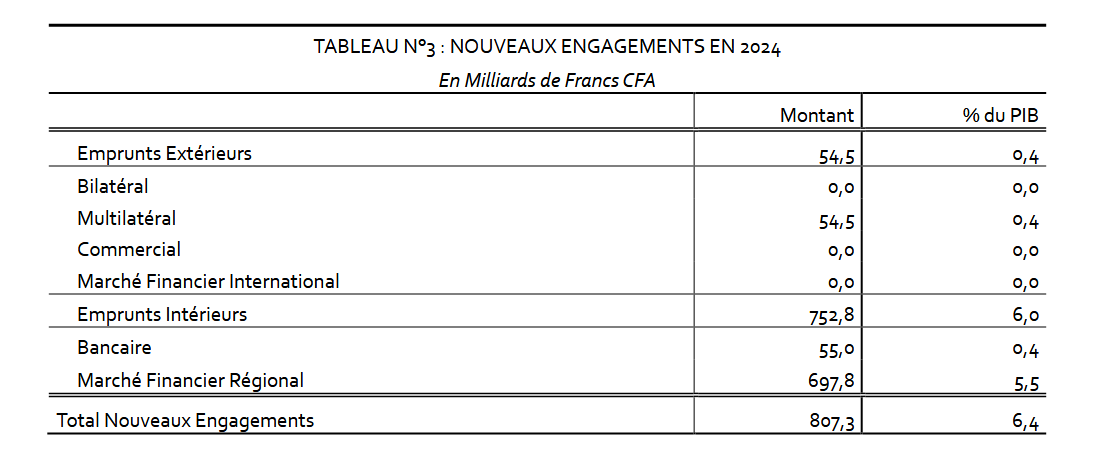 Arrêtés dans la loi de finances 2024 à 1147,9 milliards de francs CFA, les nouveaux engagements se sont établis à 807,3 milliards de francs CFA, soit un taux de réalisation de 70,3%. Cette situation résulte de la contre-performance enregistrée au niveau des nouvelles signatures extérieures notamment, l’absence de mobilisation sur le marché financier international. Ces nouveaux emprunts sont constitués de 54,5 milliards de francs CFA pour l’extérieur, et de 752,8 milliards de francs CFA pour l’intérieur contre des prévisions respectives de 569,9 milliards de francs CFA et 578,0 milliards de francs CFA. Les nouveaux engagements en 2024 enregistrent une diminution de 35,8 % par rapport à l’année antérieure en raison de la baisse des engagements extérieurs et intérieurs.
